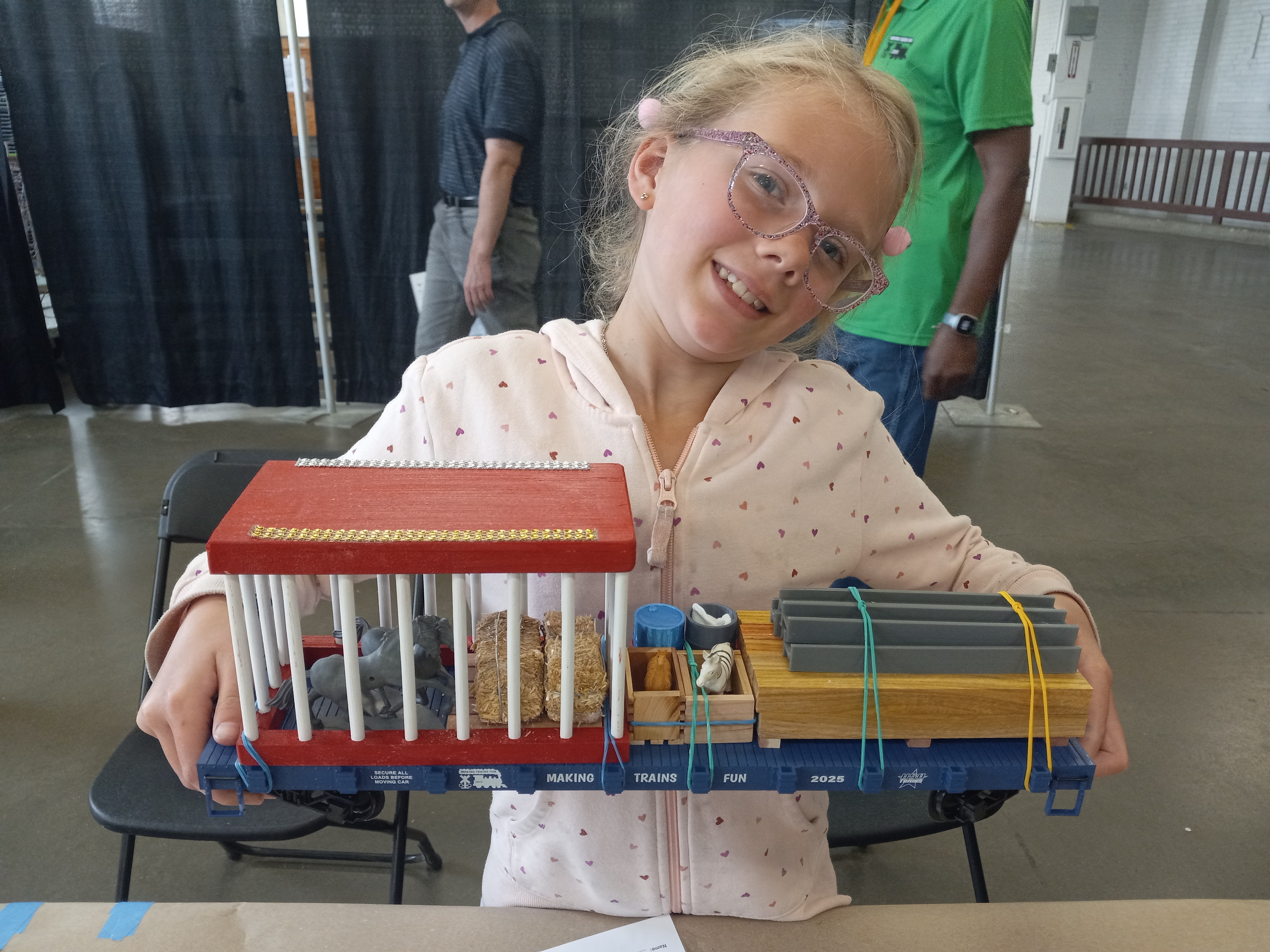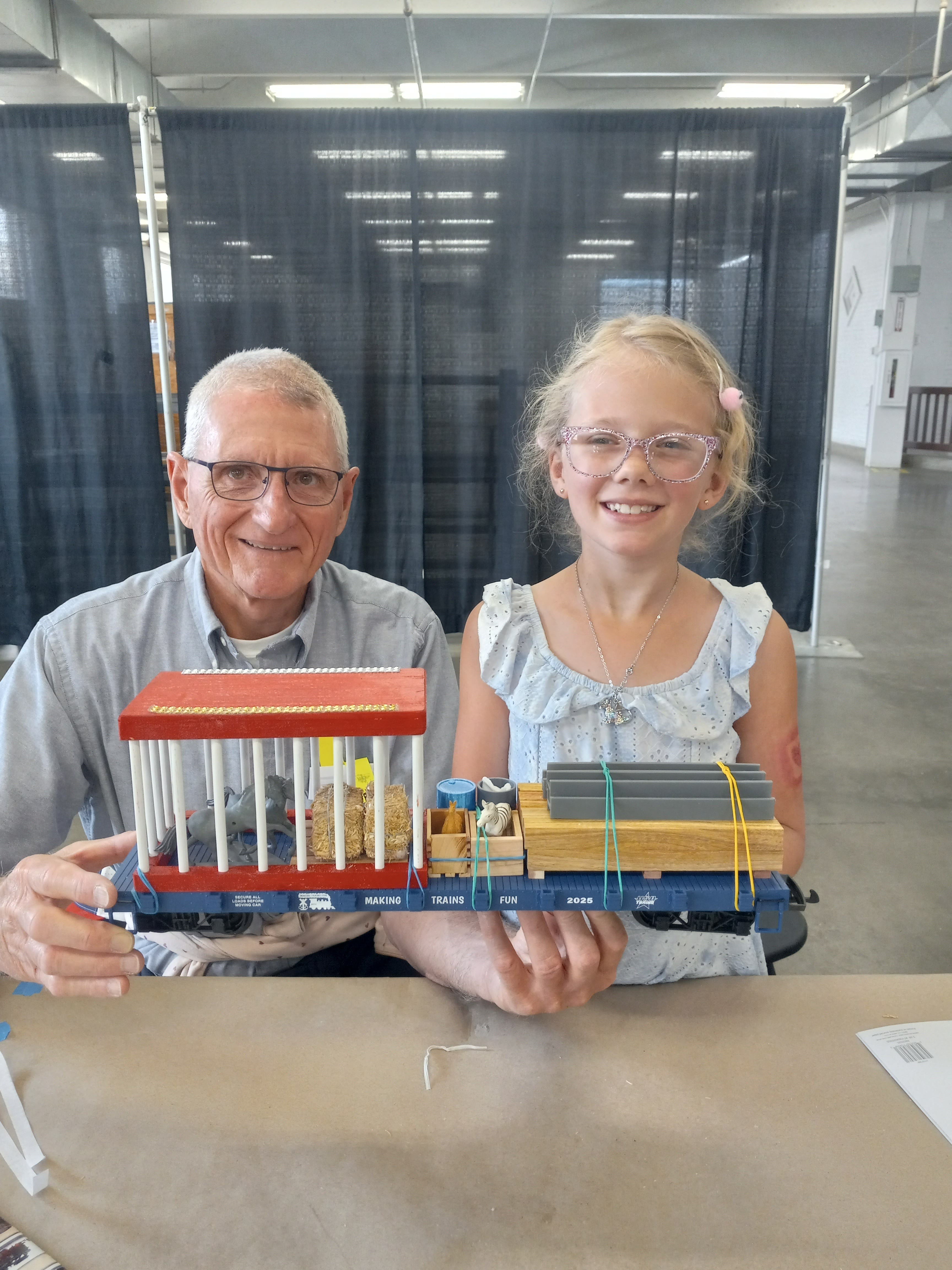 Thank you for donating the flat cars used in the MakingTrainsFun Youth Clinic last weekend (April 11-12) at the Denver Train Show held at the National Western Complex in Denver, CO. The clinic, where kids create "loads" for their flat cars, basically saved the day for our 8 year old granddaughter.